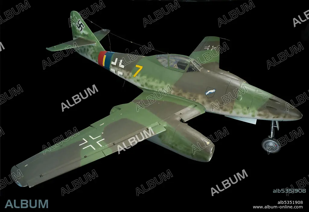 Twin engine, single seat, low wing, jet fighter. Nicknamed Schwalbe (Swallow), the Messerschmitt Me 262 surpassed the performance of every other World War II fighter. Faster than the North American P-51 Mustang by 190 kilometers (120 miles) per hour, the Schwalbe restored to the faltering German Luftwaffe a short-lived qualitative superiority that it had enjoyed earlier in the war. The Me 262 appeared in only relatively small numbers in the closing year of World War II. Messerschmitt factories produced 1,443 Me 262s, but only about 300 saw combat. The others were destroyed in training accidents or by Allied bombing attacks. The almost absolute Allied dominance of the air, and the development of fighter sweep tactics that offset the Me 262's performance advantage, ensured that the revolutionary fighter did not affect Allied air operations. Only nine Me 262s survive in museums around the world. This one served with the famous Jagdgeschwader (Fighter Wing) 7. According to the tally on the fuselage, the Schwalbe's pilot, Heinz Arnold, scored 42 victories over Soviet piston-engine fighters and 7 over American bombers and fighters.