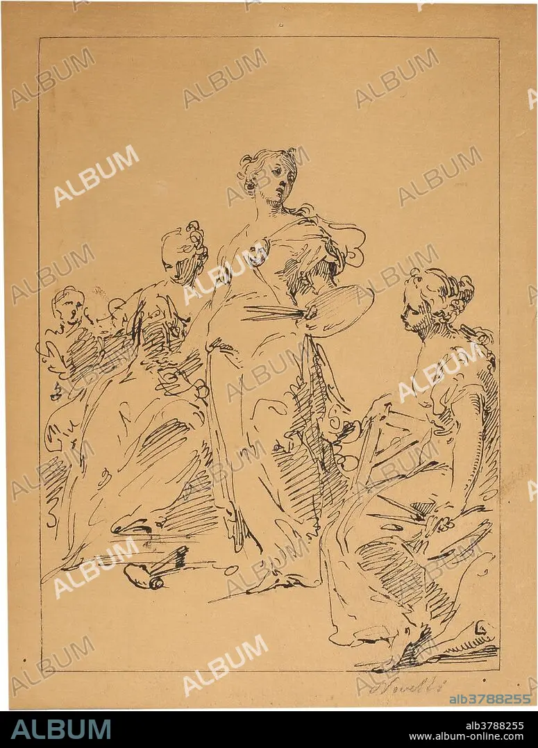 Descripción: Anónimo (Círculo de Novelli, Pietro Antonio) / 'Alegoría de las Artes'. Siglo XVIII. Pluma sobre papel marrón, 200 x 150 mm.