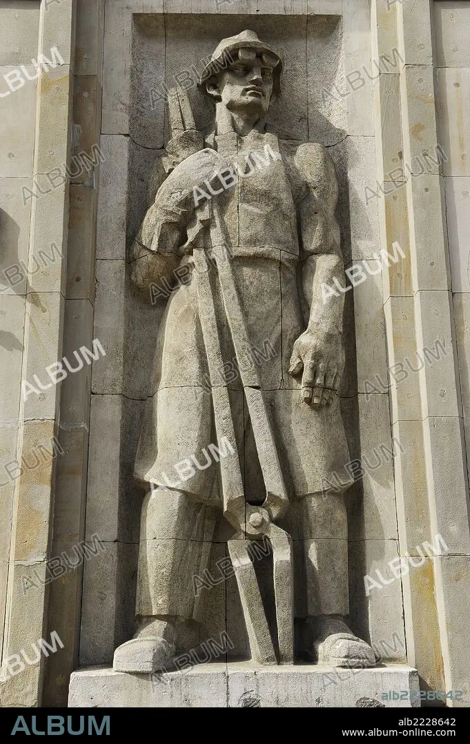POLONIA. VARSOVIA. Bajorrelieve de un herrero en la Plac Konstytucji (Plaza de la Constitución), uno de los más relevantes ejemplos del realismo socialista. Construida a principios de los años de la posguerra.
