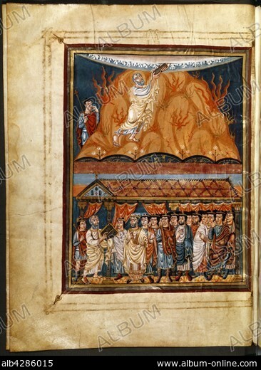Upper part: Moses receiving the Tablets of the Law on Mount Sinai. . Down: Moses explaining the law to the Jews. . Illustration from the Bible of Charles the Bald. 845-846 after J.C.. Painting on parchment. Paris, Bibliothèque Nationale de France