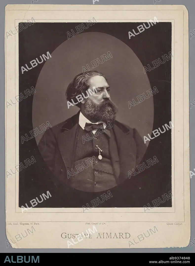 Gustave Aimard, French writer 1818-1883, Galérie contemporaine, litéraire, artistique (series title), Portrait of Gustave Aimard, French writer. This one has a lush black beard and graying hair, suit with bow tie and watch chain (?) on vest. Plate from magazine., Étienne Carjat, printer: Goupil & Cie. (mentioned on object), Paris, in or after 1876 - in or before 1884, paper, photographic support, height 228 mm × width 187 mmheight 299 mm × width 223 mm