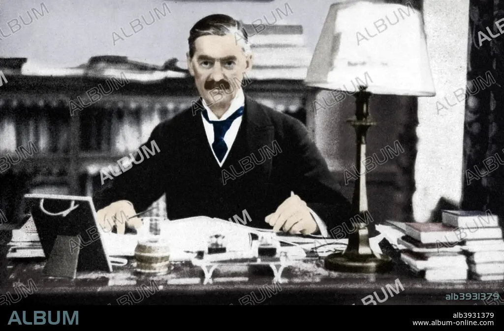 Neville Chamberlain (1869-1940), British prime minister, c1930s (1936). Following his election to parliament in 1918, Chamberlain served as postmaster general (1922-23), minister of health (1923, 1924-29, and 1931), and chancellor of the Exchequer (1923-24 and 1931-37) before he succeeded Stanley Baldwin as prime minister. His policy of appeasement toward Adolf Hitler's Germany culminated in the Munich Pact of September 1938, after which Chamberlain returned home proclaiming peace for our time. Later he recognized the failure of his policy and vowed support for Poland. After Germany's invasion of that country, Chamberlain led Britain into the war against the aggressor. He was forced to resign in May 1940 and was succeeded by Sir Winston Churchill. He served in Churchill's cabinet as lord president of the council until October 1940, when illness forced his resignation. He died the following month. From His Majesty the King, 1910-1935, introduction by HW Wilson (Associated Newspapers Ltd, London, 1936). (Colorised black and white print).