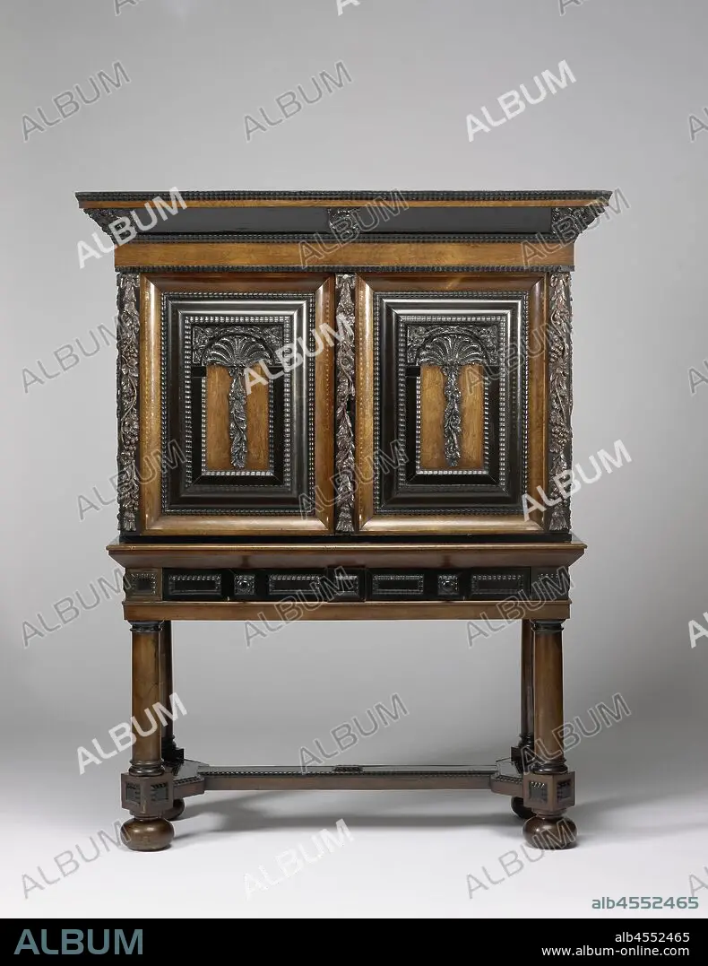 Collector's Cabinet, Table Cabinet, glued with rosewood and ebony on an oak core. The styles are decorated with festoons. Both doors have contoured profiled cushions. On the backs is a shell with trumpet-blowing angels in the swirls and a festoon in the middle. On the cornice in the middle a cartouche and on the corners a cartouche with angel figures. The frame has two drawers and legs in the shape of Tuscan columns. Spheres twisted under the legs., anonymous, Netherlands, c. 1650 - c. 1675, wood (plant material), oak (wood), rosewood (wood), ebony (wood), h 175.0 cm × w 138.0 cm × d 57.5 cm.