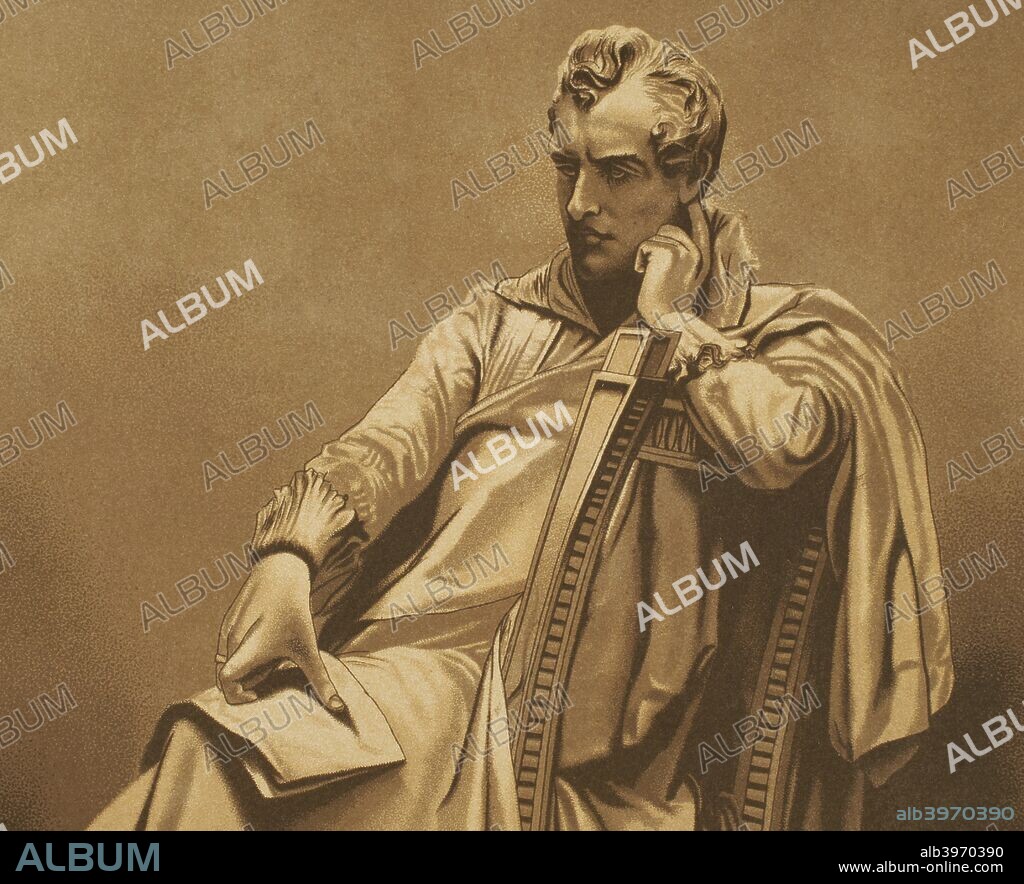 George Gordon Byron, 6º Barón Byron (1788-1824). Dibujo a partir de una estatua de Egidio Pozzi que representa al escritor romántico Lord Byron. Cromolitografía. La Civilización, tomo III, 1882. Biblioteca Histórico Militar de Barcelona. Cataluña, España.