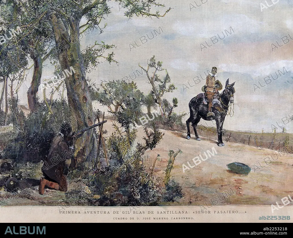 GIL BLAS DE SANTILLANA. PERSONAJE DE LA NOVELA ALAIN- RENE LESAGE. GRABADO COLOREADO SOBRE UN CUADRO DE JOSE MORENO CARBONERO.. " PRIMERA AVENTURA DE GIL BLAS ". ILUSTRACION ESPAÑOLA Y AMERICANA