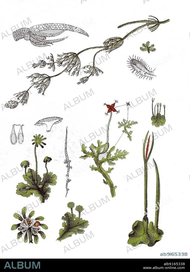Common or common chandelier alga, Chara vulgaris (top), Fountain liverwort, Marchantia polymorpha (bottom left), Fat shiny ohnnerv moss, Aneura pinguis (middle), Smooth hornwort, Phaeoceros laevis (bottom right), digitally restored reproduction of a 19th century original, exact original date unknown.