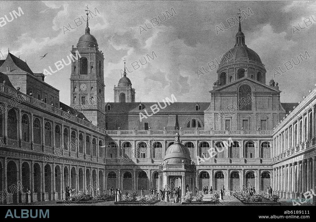 FERNANDO BRAMBILA. VISTA DEL PATIO DE LOS EVANGELISTAS DEL MONASTERIO DE SAN LORENZO DEL ESCORIAL - GRABADO SIGLO XIX