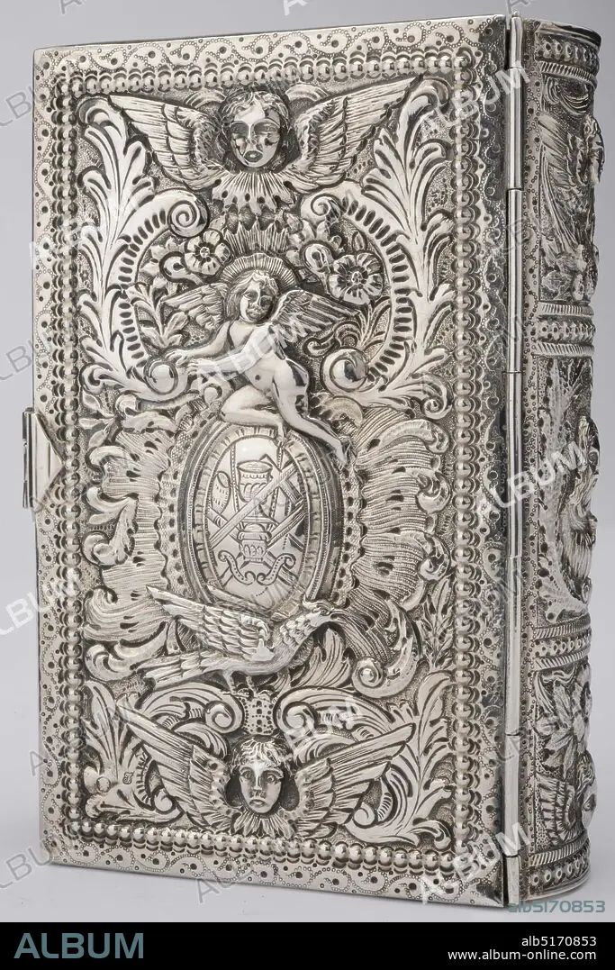 Johannes Desablijn, between 1807-1818, paper, silver, leather, General: 4.6 x 15.4 x 10.5 cm 46 x 154 x 105mm, bible, biblical representation, Silver book cover decorated in Louis XV style. The book binding consists of a hinged front and back cover and a lock, consisting of two brackets with a bracket. The front and back are decorated with a relief painting of a winged angel's head with an angel with leaf scrolls and floral motifs underneath, an oval shield with a debossed depiction, a bird and again a winged angel's head between curly tendrils. Around a pearl edge and a band with debossed, simple curl motifs. The oval shield on the front is filled with a representation of a miter, a cross and two chalices. The oval at the back with the tools of the Passion of Christ. The back is decorated with three scenes with Christ in a laurel wreath in the middle, and a winged angel's head above and below. The book cover contains an English prayer book with leather cover The Pocket Service = Book of the Church of England containing the Book of Common Prayer, published by Oxford University Press. In addition, two separate leaflets an Order of Confirmation and The Harmony of Holy Week, and seven English and German prayer cards, 1981