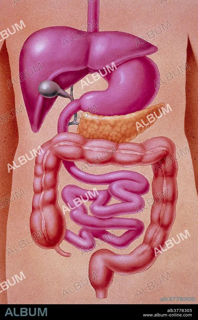 Digestive system. Illustration of the components of the human digestive system or alimentary canal, as positioned naturally over a silhouette of the human body. At top, the oesophagus is a muscular tube which leads from the mouth to the stomach. In the stomach (kidney-shaped, pink) food is digested and it passes into the duodenum (C-shaped tube) for further chemical breakdown. The gall bladder (grey bulb) secretes bile enzyme into the duodenum while the pancreas (yellow) secretes a pancreatic enzyme. Digested food then passes into the small intestine (pink) and large intestine (brown) where nutrients are absorbed into the body. The liver (purple, top) metabolises nutrients in the blood.