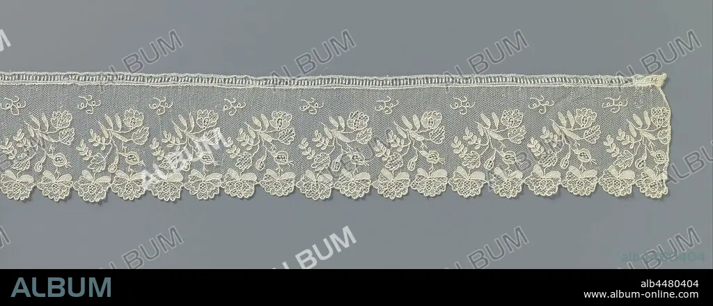 Strip of needle lace with double florets, A fine mesh soil (single mesh) is filled almost the entire width with a row of unilaterally directed hanging twigs with rose buds and two double florets that form the scallops. Alençon side, anonymous, Alençon, c. 1810 - c. 1820, linen (material), Alençon lace, l 150 cm × w 8 cm
