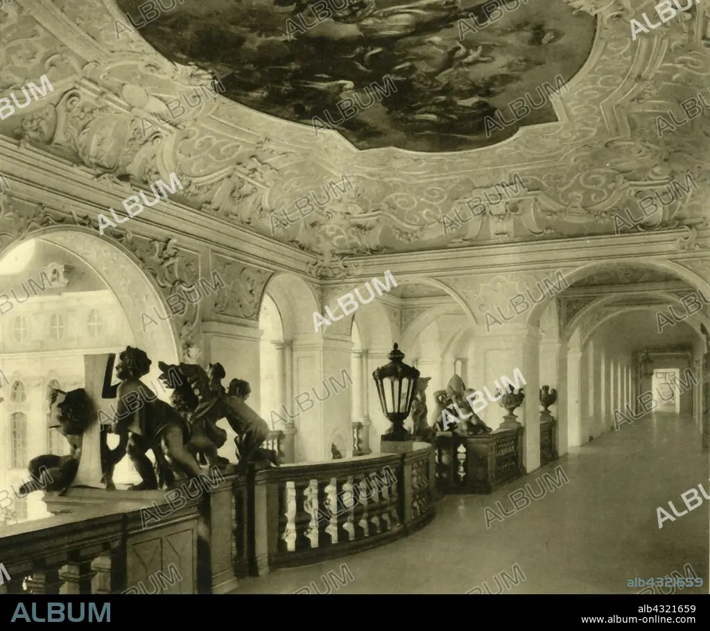 Imperial staircase, St Florian Monastery, Sankt Florian, Upper Austria, c1935. Balustrade decorated with marble chuerubs, with decorative plasterwork and ceiling frescoes by Bartolomeo Altomonte. The Augustinian monastery dedicated to St Florian was founded in the ninth century. It was rebuilt between 1686 and 1708 in Baroque style by Carlo Antonio Carlone. From "Österreich - Land Und Volk", (Austria, Land and People). [R. Lechner (Wilhelm Müller), Vienna, c1935]
