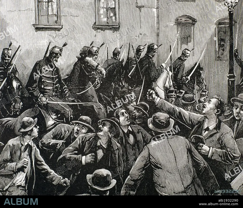 MOVIMIENTOS OBREROS. Carga de los húsares austriacos contra los huelguistas amotinados en el barrio de New-Lerchenfeld (Viena), el 8 de abril de 1890. Grabado.