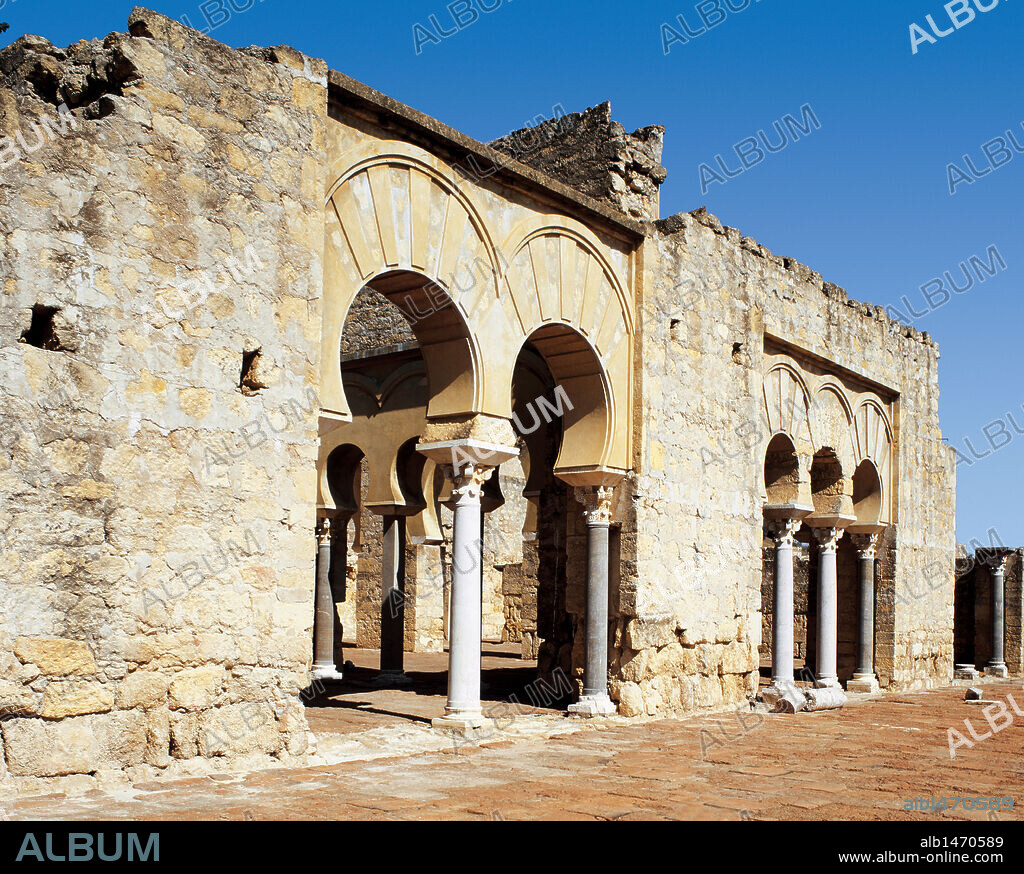 ARTE ISLAMICO. EPOCA OMEYA. ESPAÑA. MEDINA AZAHARA. Vista de la fachada de la CASA DE LOS VISIRES, destinada al uso burocrático, y que posee arcos de herradura. Antigua ciudad palatina del califa omeya Abd-er-Rahman III. En el año 936 se inició su construcción, concluyéndose las obras en el 960. Provincia de Córdoba. Andalucía.