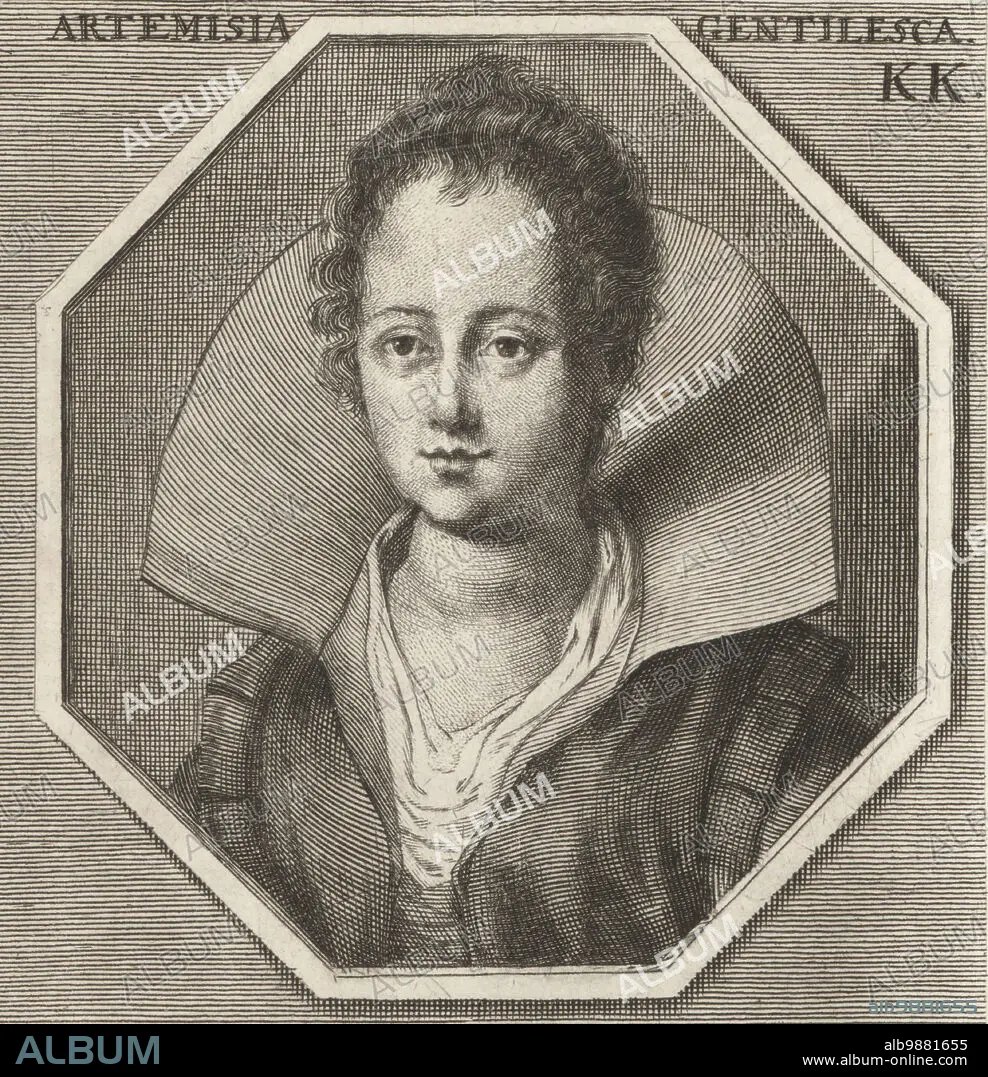 Artemisia Lomi or Artemisia Gentileschi, Italian Baroque painter, 1593-c.1656. Daughter of artist Orazio Gentileschi. Artemisia Gentilesca. Copperplate engraving after an illustration by Joachim von Sandrart from his LAcademia Todesca, della Architectura, Scultura & Pittura, oder Teutsche Academie, der Edlen Bau- Bild- und Mahlerey-Kunste, German Academy of Architecture, Sculpture and Painting, Jacob von Sandrart, Nuremberg, 1675.