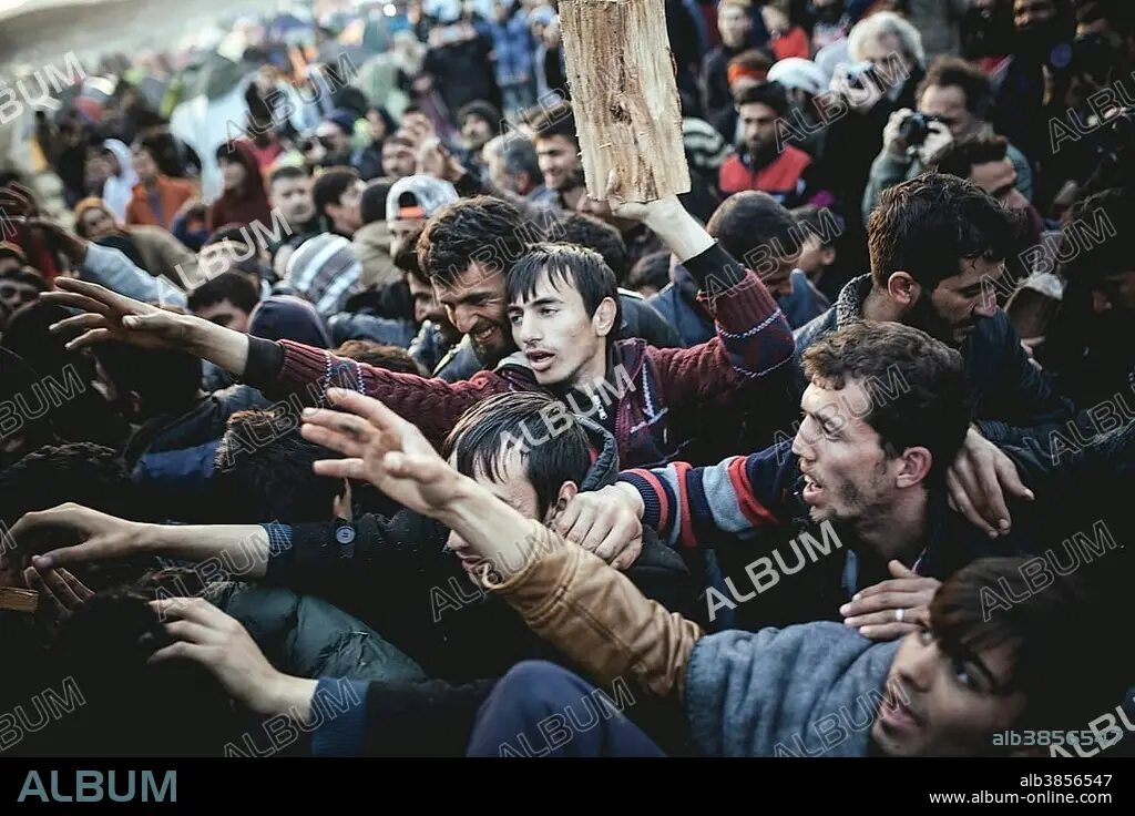 Idomeni refugee camp on the Greece Macedonia border, refugees waiting for the firewood delivery, Idomeni, Central Macedonia, Greece