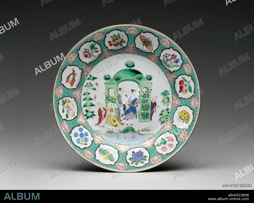 Design attributed to Cornelis Pronk, Plate with figures in arbor, Chinese, for Dutch market, ca. 1740, Chinese, for Dutch market, Hard-paste porcelain painted with colored enamels over transparent glaze (Jingdezhen ware), Diameter: 11 in. (27.9 cm), Ceramics-Porcelain-Export.