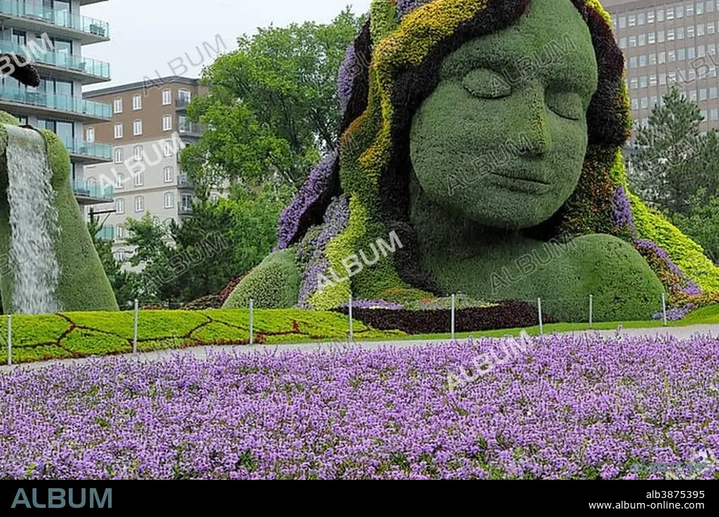 Plant sculpture Mother Earth with modern buildings behind, Mosaicanada Exhibition, Gatineau, Quebec Province, Canada