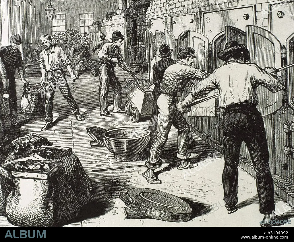 Descripción: HISTORIA DE LOS ESTADOS UNIDOS. SIGLO XIX. "OBREROS TRABAJANDO EN EL PROCESO DE FUNDICION Y REFINAMIENTO DE LA PLATA". (Ciudad de VIRGINIA). Grabado que fue publicado en el periódico "Frank Leslie's" en el año 1878.
