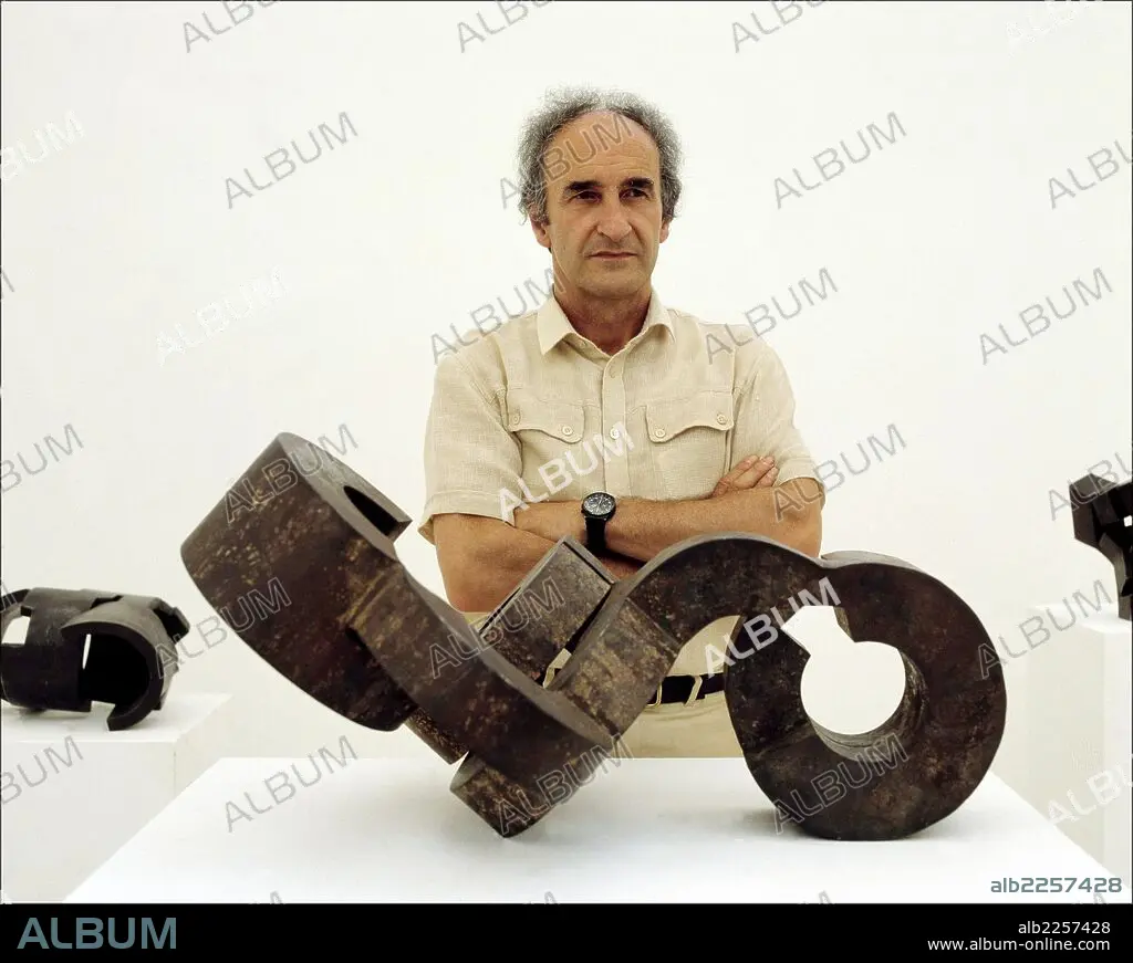 Descripción: CHILLIDA , EDUARDO. ESCULTOR ESPAÑOL. SAN SEBASTIAN 1924 - 2002. ANTE UNA DE SUS OBRAS. RETRATO