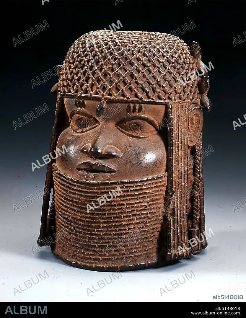 Head of an Oba (King), brass, iron, bronze, cast, bronze, iron, cast, Total: Height: 26.8 cm; Diameter: 19.3 cm, sculptures, statues, statuary, ruler portrait, state portrait, ruler/landlord, portrait of the dead, head, face, The commemorative head shows a ruler of the people of West African Benin. He wears a chin wrap and a hood with a curtain, which is a replica of real jewelry made of pierced carnelian. On the right side of the head hangs a hair braid, above it a rosette-like four-piece piece of jewelry; on the left side there are two braids and pieces of jewelry of the same type. Neck collar and plait jewelry belong to the ceremonial garb of the Oba. Above the eyes are three tattoo scars each. On the head there is a round opening. Each Oba erected an altar to his predecessor and his deceased queen mother, on which in addition to cult objects at least one such memorial head was placed. In the middle period, to which this head belongs, elephant tusks, partly decorated with carvings showing historical events, protruded from the head holes.