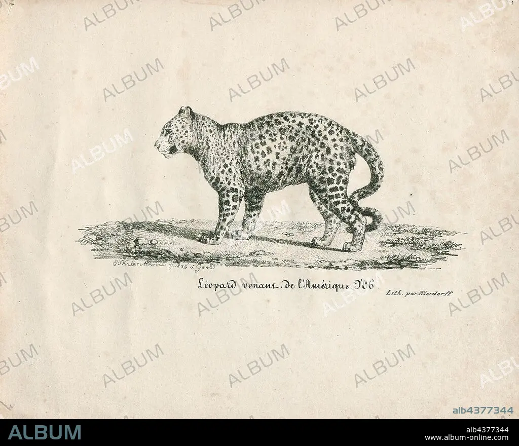 Felis onca, Print, The jaguar (Panthera onca) is a large felid species and the only extant member of the genus Panthera native to the Americas. The jaguar's present range extends from Southwestern United States and Mexico in North America, across much of Central America, and south to Paraguay and northern Argentina in South America. Though there are single cats now living within the Western United States, the species has largely been extirpated from the United States since the early 20th century. It is listed as Near Threatened on the IUCN Red List; and its numbers are declining. Threats include loss and fragmentation of habitat., 1825