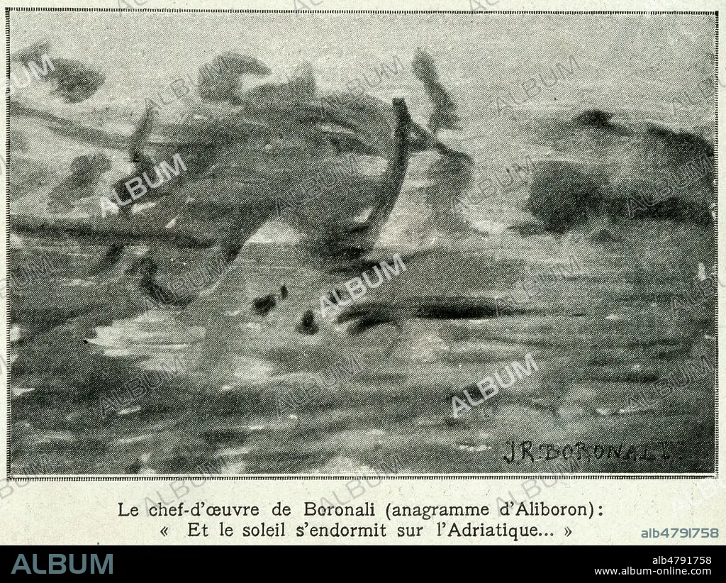 'Le chef d'oeuvre de Boronali (anagramme d'Aliboron) : 'Et le soleil s'endormit sur l'Adriatique....'.' Au Salon des independants de 1910 on exposa cette peinture d'un denomme BORONALI, avant de reveler que la dite peinture avait ete realisee par la queue d'un ane a laquelle Roland DORGELES et ses amis avaient accroche un pinceau. L'ane, Aliboron, appartenait au patron du 'Lapin agile', celebre cabaret de la butte. Photographie tiree de l'Illustration d'avril 1910. Credit : Collection KHARBINE-TAPABOR.