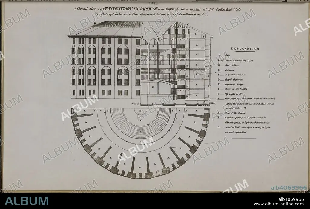 A general idea of a penitentiary panopticon in an improved, but as yet, Jan 23rd, 1791 unfinished state ... The works of Jeremy Bentham / published under the superintendence of his executor, John Bowring. Edinburgh : William Tait, 1843, 38-43. Source: 12274.d.1.