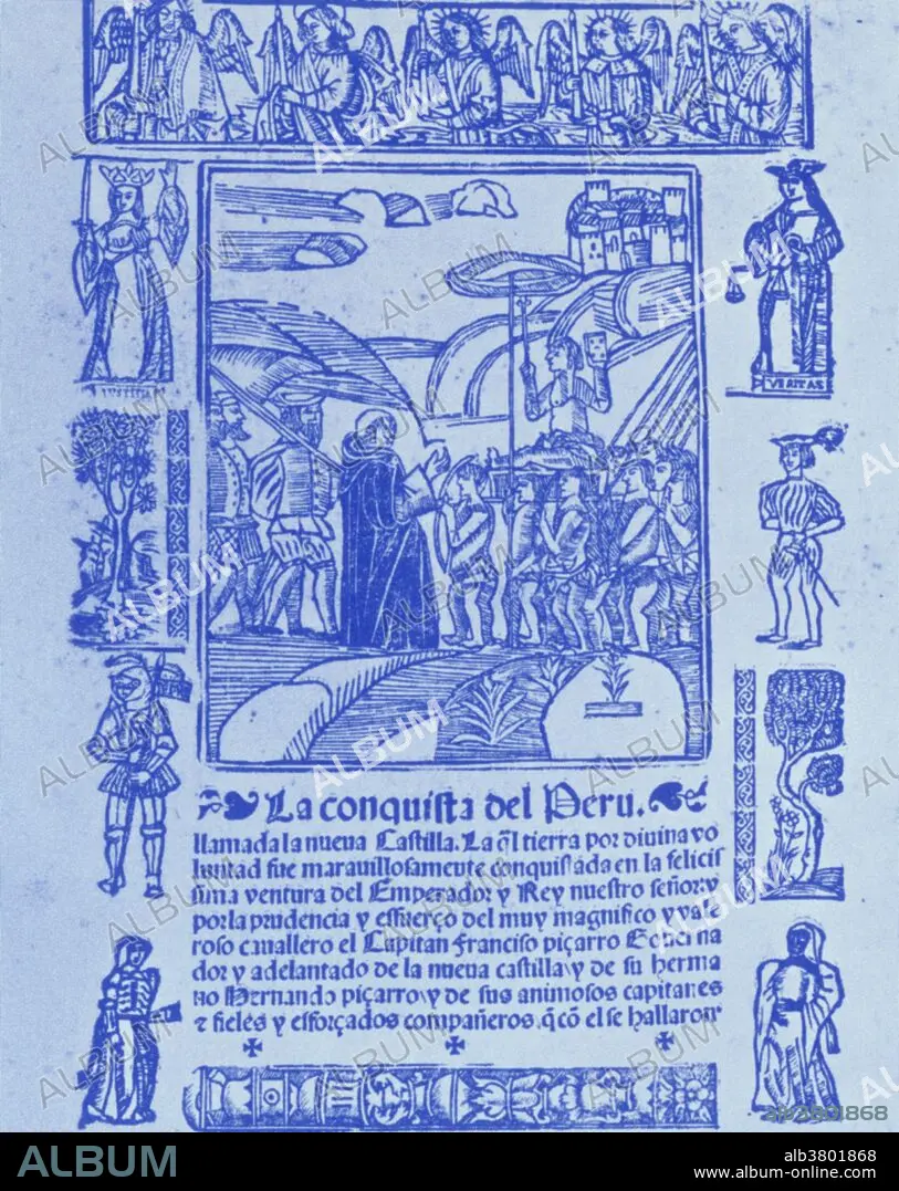 This 1534 woodcut, title page of an anonymous chronicle attributed to a member of the expedition, shows Atahualpa seated on a litter, being offered a Bible by the priest Valverde. Atahualpa (1497-1533) was the last sovereign emperor of the the Inca Empire, prior to the Spanish conquest of Peru. During the Spanish conquest of the Inca Empire, the Spaniard Francisco Pizarro captured Atahualpa and used him to control the Inca empire. The outnumbered Spanish saw Atahualpa as too much of a liability and decided to execute him. Pizarro staged a mock trial and found Atahualpa guilty of revolting against the Spanish, practicing idolatry, and murdering Huascar, his brother. Atahualpa was sentenced to execution by burning. Atahualpa was sentenced to be burned but agreed to convert to Catholicism. He was given the name Juan Santos Atahualpa. He was strangled with a garrote and following his execution, his clothes and some of his skin were burned.