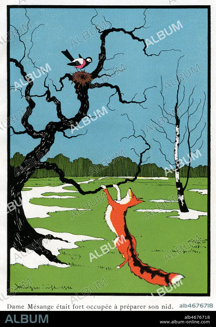 Dame Mesange etait fort occupee a preparer son nid. Illustration de 1932 par Xavier KOZMINSKI (1892-1940) pour Le Roman de Renart. Credit : Coll. Jonas/KHARBINE-TAPABOR.