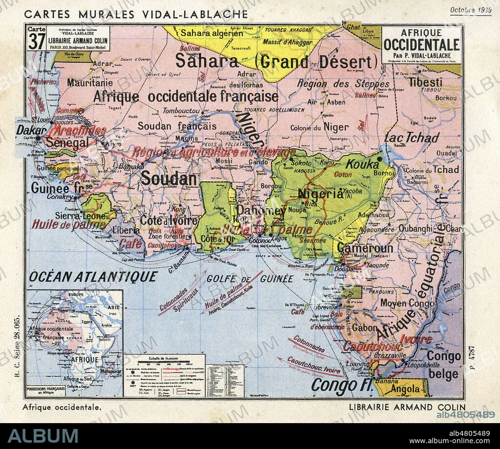 Carte geographique representant l'Afrique Occidentale Francaise dite AOF, pays colonises par la France, et leurs richesses exportees, en 1939 . Carte murale Vidal-Lablache, carte de l'Afrique occidentale. Illustration anonyme. Materiel scolaire annees 30. Credit : Collection IM/KHARBINE-TAPABOR.