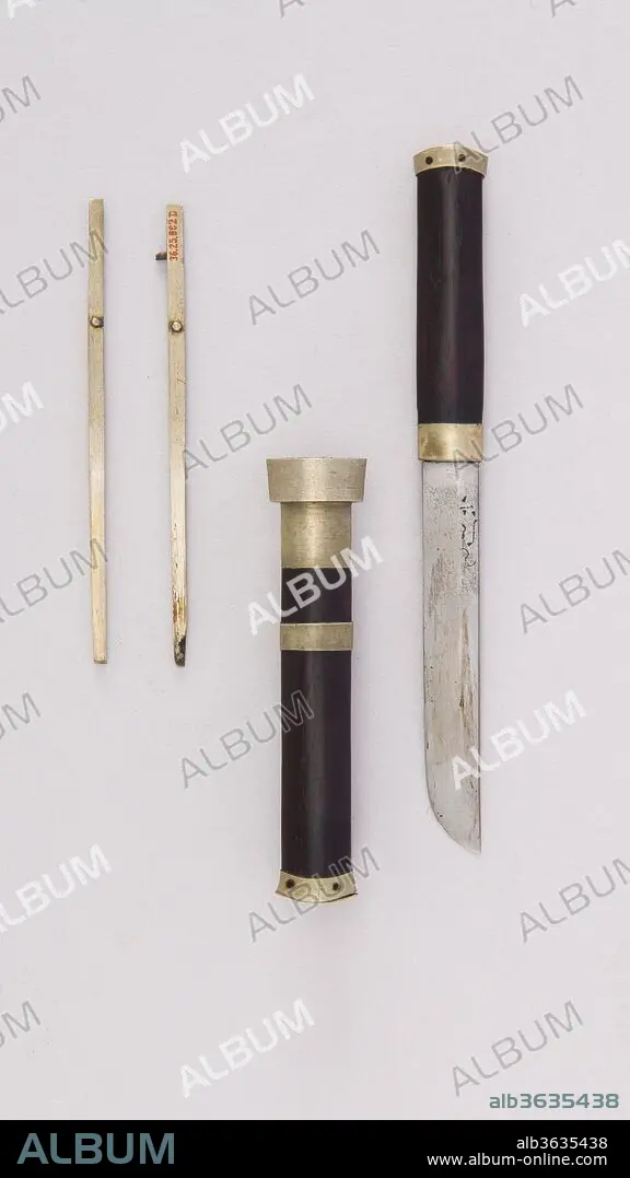 Knife with Sheath and Chopsticks. Culture: Korean. Dimensions: Knife (a); L. with sheath 5 5/8 in. (14.3 cm); L. without sheath 5 1/2 in. (14 cm); W. 9/16 in. (1.4 cm); Wt. 0.7 oz. (19.8 g); sheath (b); Wt. 0.9 oz. (25.5 g); chopsticks (c, d); L. 3 5/8 in. (9.2 cm); W. 1/8 in. (0.3 cm); Wt. 0.2 oz. (5.7 g). Date: 19th century.