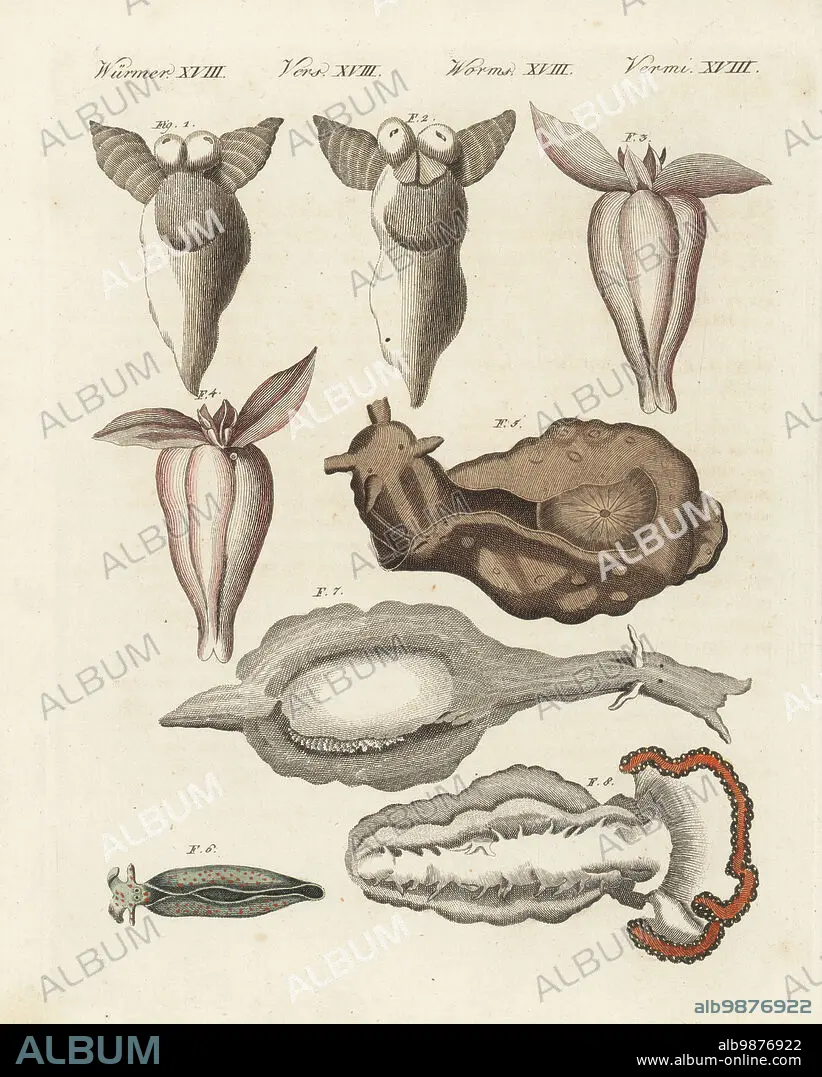 Naked sea butterfly or sea angel, Clione limacina 1,2, Clione limacina australis 3,4, depilatory sea hare, Aplysia depilans 5, sap-sucking slug, Elysia viridis 6, mottled sea hare, Aplysia fasciata 7 sea slug, Tethys fimbria 8. Handcoloured copperplate engraving from Carl Bertuch's Bilderbuch fur Kinder (Picture Book for Children), Weimar, 1810.. Clio borealis 1,2, Clio australis 3,4, Aplysia depilans 5, Aplysia viridis 6, Aplysia camelus 7, Tethys fimbria 8.