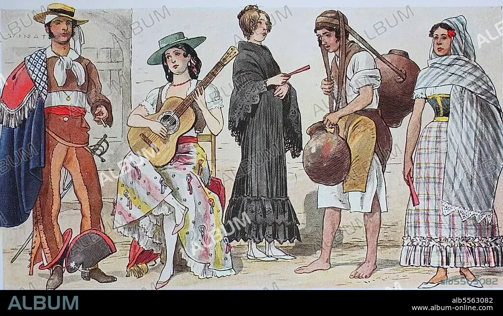 Clothing, early 19th century, from lks, e hacendado, e landowner, then ee maja in silk dress, then ee Mexican, then ee water carrier and ee creole skirt and cape, digitally restored reproduction of an original 19th century fashion in Central America, Mexico