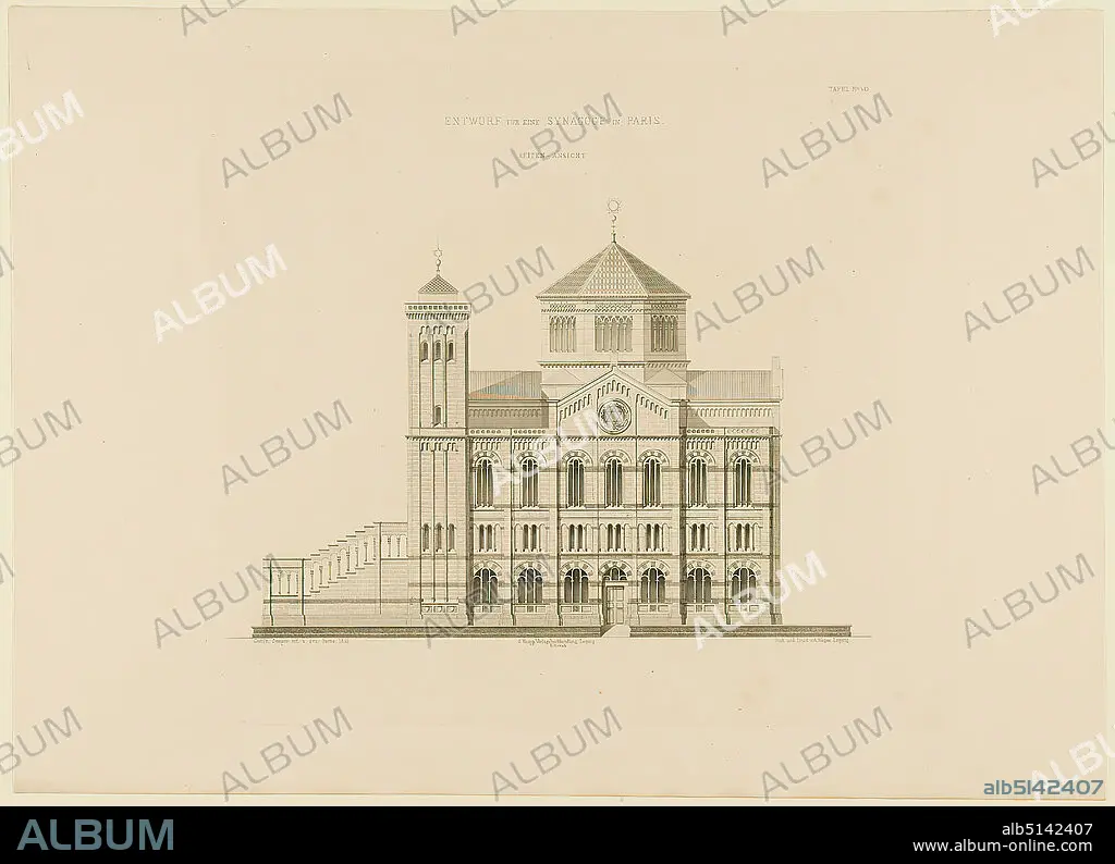 G. Knapp, Verlagsbuchhandlung Leipzig, Gottfried Semper, design for the synagogue in Paris. Side view, old stock, probably a 1903, paper, copperplate engraving, sheet size: height: 47 cm; width: 61.7 cm, inscribed: in the printing plate: Gottfr. Semper invented and signed: Paris 1851, engraving and printing by A. Weger, Leipzig, G. Knapp, Verlagsbuchhandlung, Leipzig. E. Nowák, TAFEL No. 40, stamp: address, graphics, draft, plan of a building, architecture, tabernacle, temple, synagogue, sanctuary (Jewish religion), hist. Building, locality, street.