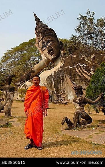 Buddhist monk wearing an orange robe in front of a Reclining Buddha statue, Buddha Park, Suan Xieng Khuan, near Vientiane, Laos, Southeast Asia, Asia.