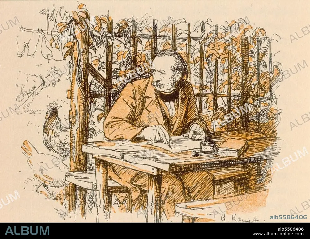 Fontane, Theodor; écrivain allemand . 1819-1898. "Fontane écrit dans sa maison". (Séjour à la campagne). D'ap. un dessin d'Arthur Kampf (1864-1950). Tiré de: Velhagen & Klasings Almanach, Berlin, Bielefeld, Leipzig, Vienne 1928.