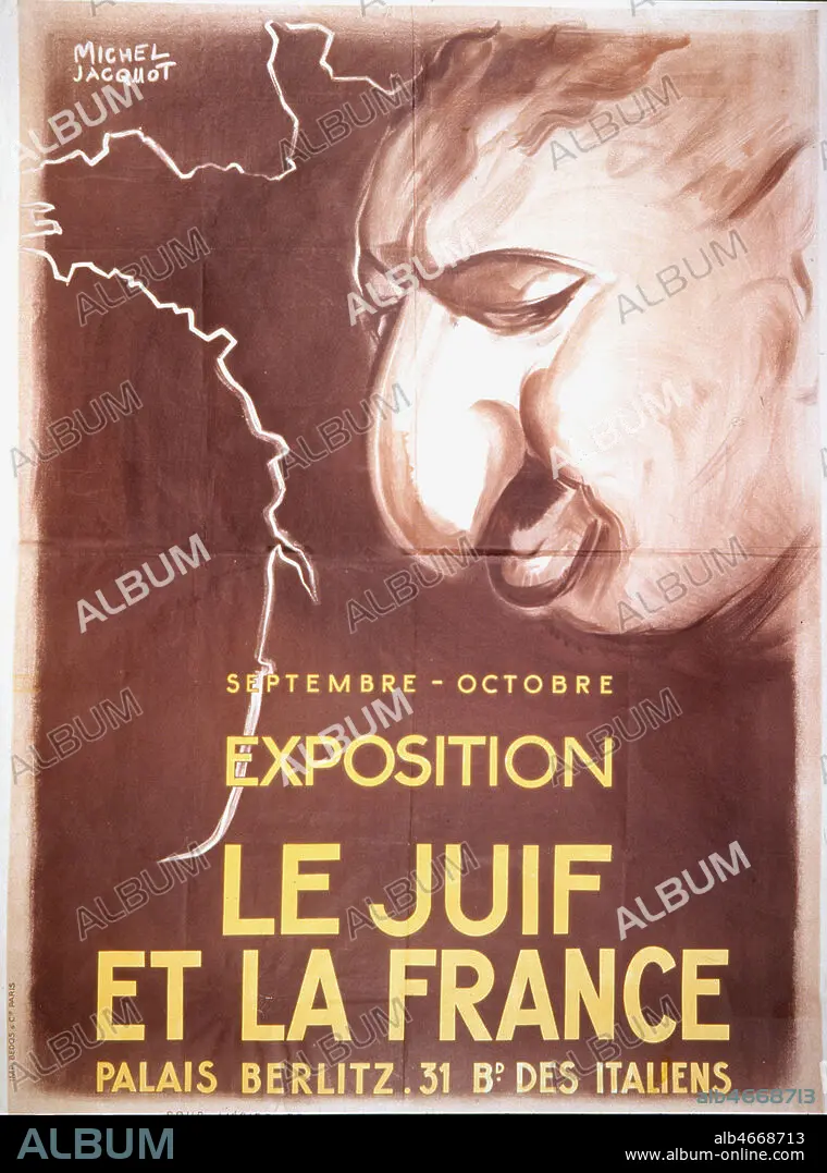 'Exposition le juif et la France'. Affiche de 1941 illustree par Michel JACQUOT. Exposition Le Juif et la France au palais Berlitz, a PARIS en septembre 1941. Exposition violemment antisemite utilisee par le gouvernement de Vichy pour justifier la repression contre les juifs. 200 000 personnes sont allees la visiter. Propagande antisemite pendant la 2eme guerre mondiale par l'Institut des questions Juives. Credit : Collection KHARBINE-TAPABOR.