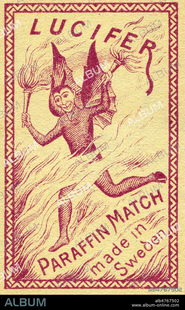 'Lucifer, paraffin match'. Etiquette de boite d'allumettes suedoise, vers 19350. Illustrations anonymes. Credit : Collection IM/KHARBINE-TAPABOR.