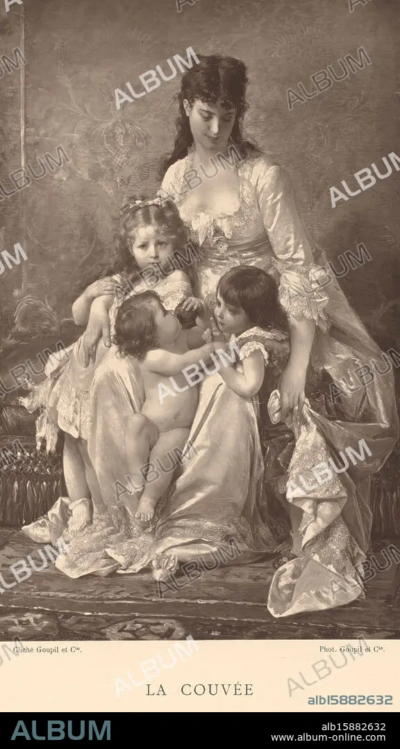 Photo reproduction of the painting 'La couvée' by Timoléon Lobrichon, La couvée (title on object), maker: Goupil & Cie., after painting by: Timoléon Marie Lobrichon, c. 1877 - in or before 1882, paper, height 250 mm × width 157 mm, photomechanical print.