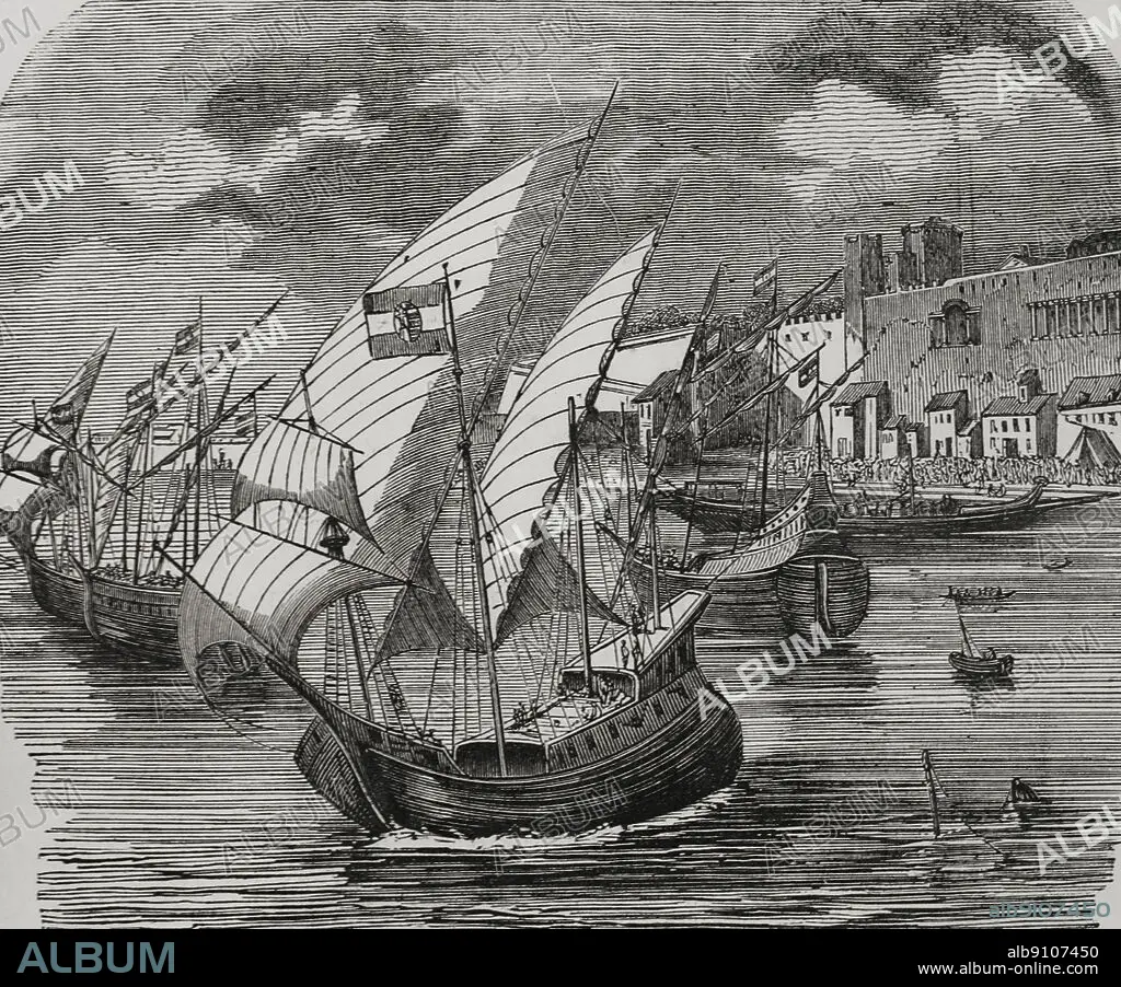 HENRI THÉOPHILE HILDIBRAND (1824-1897). FRENCH ENGRAVER.. A Hungarian fleet squadron in the late 14th century. Engraving by Hildibrand. "Los Héroes y las Grandezas de la Tierra" (The Heroes and the Grandeurs of the Earth). Volume VI. 1856.