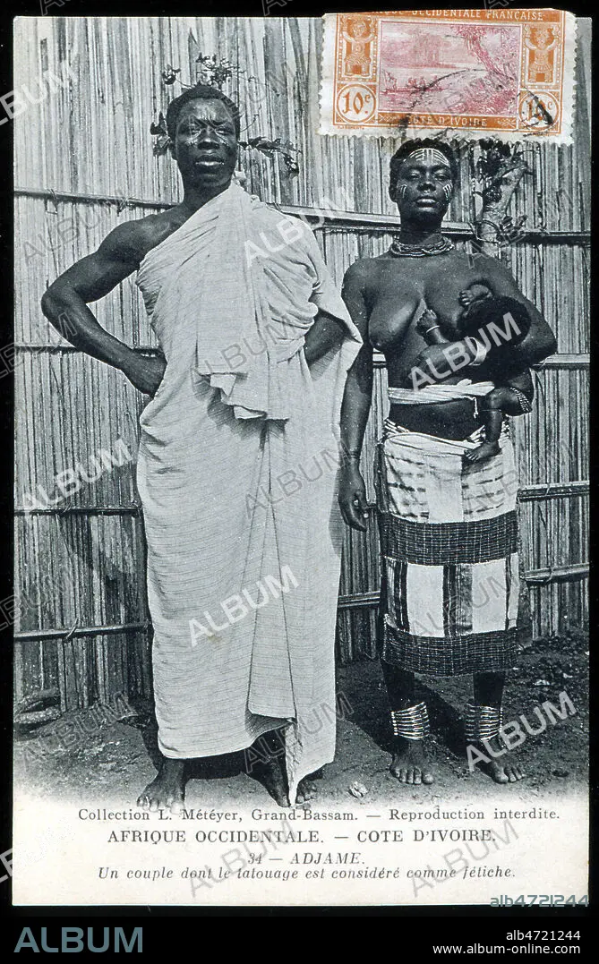 'Afrique occidentale, Cote d'Ivoire, Adjame, un couple dont le tatouage est considere comme fetiche', carte postale vers 1910. Credit : Collection IM/KHARBINE-TAPABOR.