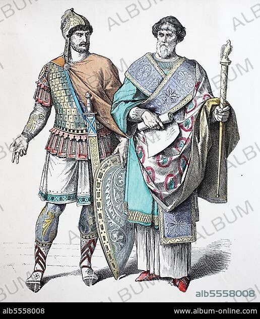 Folk traditional costume, Clothing, History of costumes, Byzantine garments, Warriors and imperial chancellors, Byzantium, Historical, digitally restored reproduction of a 19th century original, exact date unknown