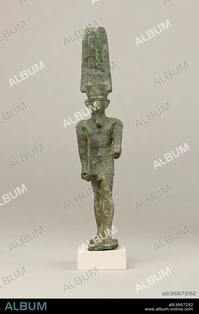 Amun was one of Egypt's most celebrated deities, worshipped as a universal, cosmic god and frequently called the king of the gods. In copper alloy he is almost invariably shown, as here, in anthropomorphic form wearing a short kilt and a tall double feather crown with a sun disc, which alludes to his solar and cosmic aspects, including his conflation with the sun god Re. Further elaborations on this statuette include a broad collar and arm bands. His right hand is socketed for the attachment of an attribute.