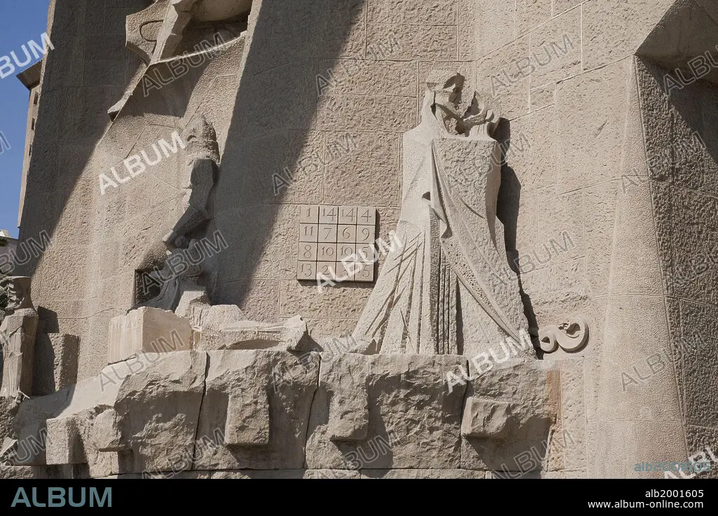 The construction of this unique Temple began in 1882, and one year later Antoni Gaudi was appointed Project Director. He worked on the project over 40 years until his death in 1926. The temple has three facades (named: 'Nativity', 'Passion' and 'Glory'), each bearing four souring towers. Eight of the twelve bell towers of the facades, dedicated to the Apostles and having a height exceeding 100 meters, are already built. The four belfries awaiting construction are those of the Facade of Glory, the 170-meter central dome in honor of Jesus Christ, the Tower of the Virgin Mary (125m) and the Tower of the 4 Evangelists. Seen here are statues by the sculptor Josep Maria Subirachs on the Passion Facade (southwestern lateral facade). Subirachs began his work in 1987 following the ideas of Gaudi, but not his style. In this scene: The kiss of betrayal of Judas. A snake on the wall next to Judas' feet represents the devil who tempted him to betray Jesus. On the wall behind is a numerical magic square (cryptogram), that contains 16 numbers offering a total of 310 combinations all adding up to 33, the age of Christ at his death.