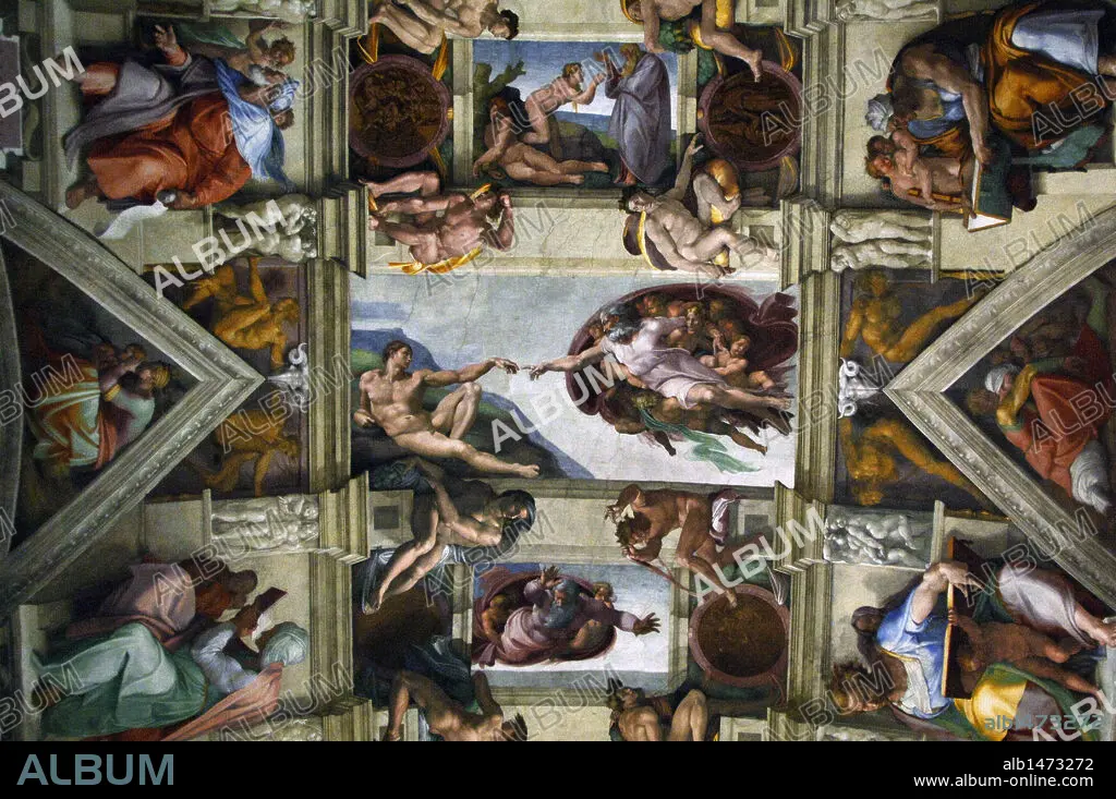 Michelangelo (Michelangelo Buonarroti) (1475-1564). Italian artist. Ceiling of Sistine Chapel. Detail with The Creation of Adam. Fresco. C.1512. Vatican Museums. Vatican City.
