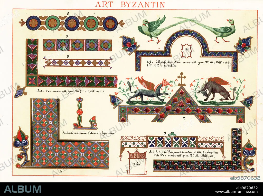 Initials, frames, motifs and chimera from Byzantine art, 10th century.. Taken from the illuminated Psalter of Paris, Constantinope, and an illuminated manuscript by Eusebius of Caesarea. 1,2 manuscrit grec 64 Eusebius Cæsariensis, Bib. Nat., 3-8 manuscrit grec 139 Psautier de Paris, manuscrit grec 79, initiale composee delements Byzantins. Chromolithograph designed and lithographed by Ernst Guillot from Elements dOrnementation pour lEnluminure (Elements of Ornamentation for Illumination), Renouard, Paris, 1890.