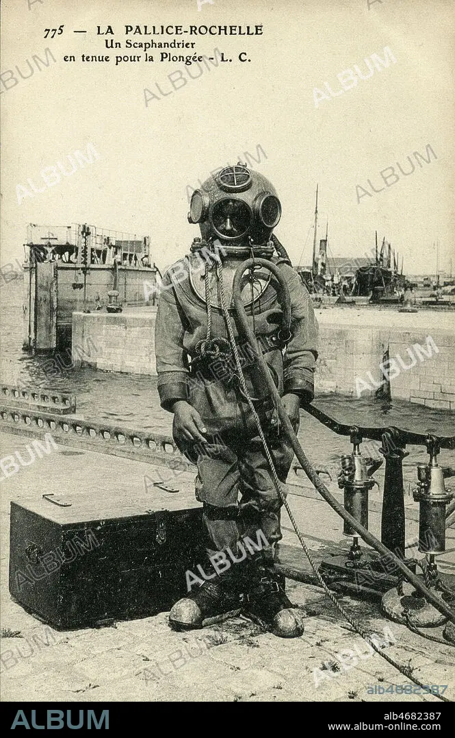 La Pallice-Rochelle. Un scaphandrier en tenue de plongee. Photographie anonyme pour une carte postale vers 1910. Credit : Collection IM/KHARBINE-TAPABOR.