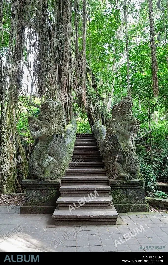 Two stone dragon statues guarding the stairs at the holy bathing pool of Pura Dalem Agung Padangtegal or Monkey Forest Temple, Ubud, Bali, Indonesia, Asia.