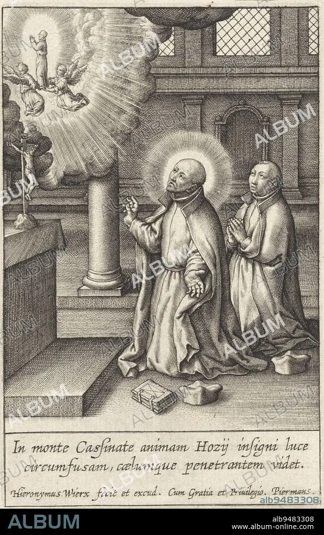 Ignatius of Loyola and another Jesuit are kneeling before an altar in a church. In front of them a vision of the soul of the Jesuit Diego Hoces being taken to heaven by angels. In the margin a two-line caption in Latin., Ignatius of Loyola has a vision of the ascension to heaven of Diego Hoces Life of Ignatius of Loyola (series title) Vita B.P. Ignatii de Loyola Fvndatoris Societatis Iesv (series title), print maker: Hieronymus Wierix, (mentioned on object), Hieronymus Wierix, publisher: Hieronymus Wierix, (mentioned on object), Antwerp, 1611 - 1615, paper, engraving, h 105 mm × w 67 mm.
