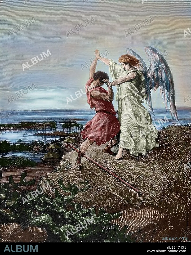 Jacob wrestling with the Angel. Engraving by Laplante. The Bible in pictures by Gustave Dore. 19th century. Colored.